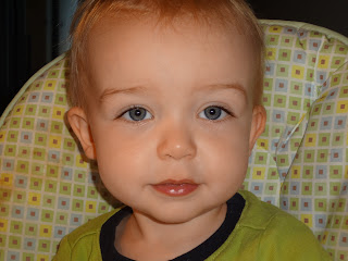 Jameson very suspicious that we're going to take away the rest of his snack. You can see he is much relieved in the next picture that we in fact added to his tray instead of taking away!